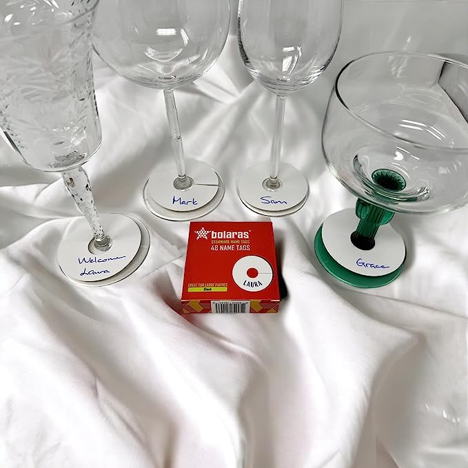 Keep your drink from being picked up and enjoyed by other people by labeling your glass with a disposable stemware name tag from Bolaras.